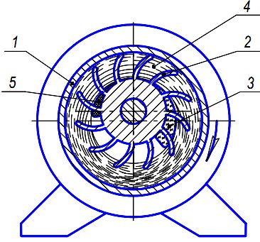 В циліндричному корпусі 1 ексцентрично розташоване робоче колесо 2 з лопатками, які при обертанні колеса відкидають воду до стінок корпусу, утворюючи обертове водяне кільце 4.